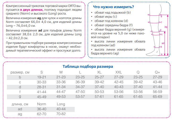 Плотные бархатистые колготки II класса компрессии помогут предотвратить развитие варикоза во время беременности. Могут назначаться врачом в комплексе лечения тромбофлебита поверхностных и глубоких вен. Имеют специальную некомпрессионную вставку в области живота, используются для профилактики болезней вен во II триместре беременности, при наличии расширенных вен, капиллярных сеточек. Особенности: две длины NORMAL и LONG — облегчает подбор изделий на любой рост и телосложение Трикотаж ORTO II класса компрессии показан людям, страдающим варикозной болезнью, а также пациентам, получающим комплексную терапию по поводу тромбофлебита поверхностных или глубоких вен. Достигаемый эффект За счет умеренной эластической градуированной компрессии значительно снижается кровоток по измененным поверхностным венам, что позволяет оптимизировать венозный возврат крови и предотвращает или существенно снижает образование отека. Микромассаж оказывает антицеллюлитный эффект. Показания к применению: варикозное расширение вен посттромбофлебическая болезнь состояние после склеротерапии после оперативных вмешательств на венах острый тробофлефит профилактика тромбозов глубоких вен в группах риска