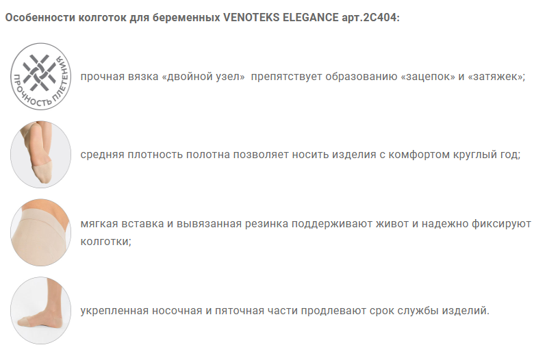 VENOTEKS ELEGANCE эффективно снимают дневные отеки при статических нагрузках, уменьшают ночные судороги в ногах (венозного происхождения) и препятствуют дальнейшему прогрессированию варикозной болезни и развитию её осложнений. Колготки рекомендованы для лечения поражения вен на уровне подколенной ямки голени и/или стопы у беременных женщин.
