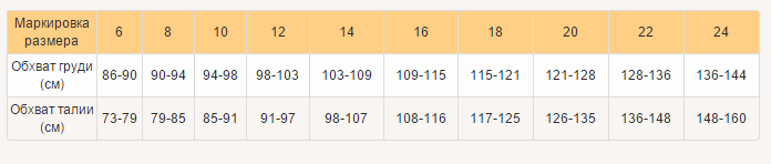 Таблица размеров: