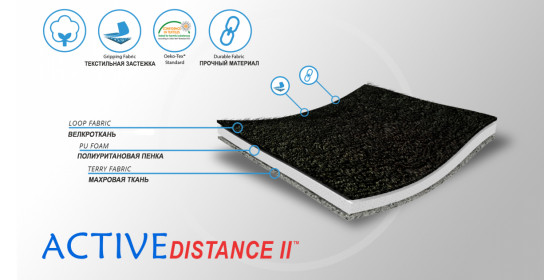 ActiveDistance II™ активный трехслойный материал, состоящий из очень прочной нерастягивающейся обложки из полиамидной велкроткани, комфортной пенки и хлопчатой махровой подкладки, которая поддерживает нужный микроклимат около кожи и эффективно отводит пот. Подкладка приятная для кожи и имеет сертификат Oeko-Tex Standard 100. Поверхность для липучек велкроткани существенно облегчает использование ортезов изготовленных из этого материала.