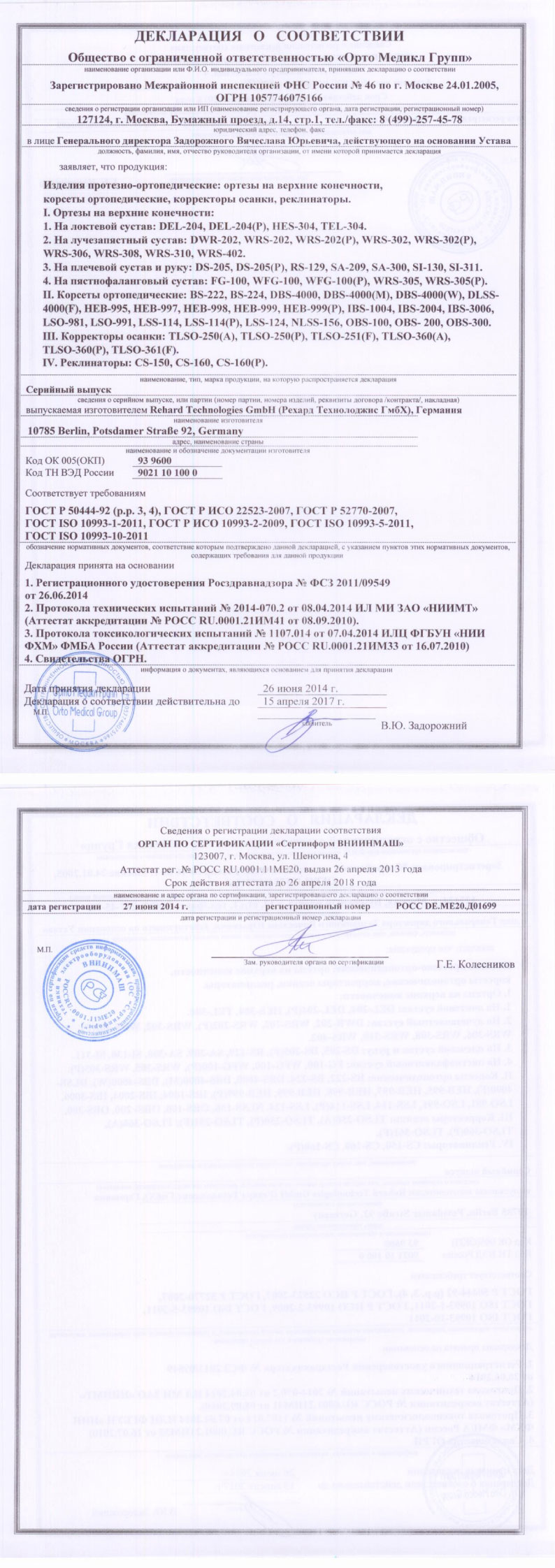 Декларация соответствия и Регистрационное удостоверение.