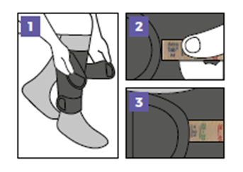 Натяните каждый ремешок до предписанного уровня компрессии, указанной линиями на <21 мм рт. ст., 23-32 мм рт. ст. или 34-46 мм рт. ст.