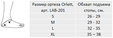 Чтобы правильно подобрать необходимый размер ортеза Orlett LAB-221 необходимо измерить сантиметровой лентой плотно, но не утягивая, обхват подъема стопы. Далее воспользоваться таблицей: