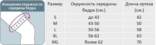 Для правильного подбора подходящего размера коленного тутора (ортеза) Orlett KS-601 необходимо сантиметровой лентой измерить окружность середины бедра и воспользоваться таблицей