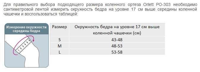 Для правильного выбора подходящего размера коленного ортеза Orlett PO-303 необходимо сантиметровой лентой измерить окружность бедра на уровне 17 см выше середины коленной чашечки и воспользоваться таблицей: