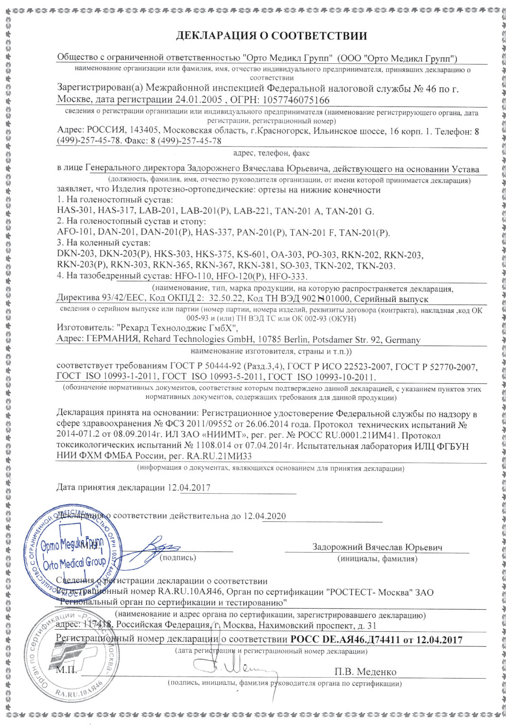 Сертификаты и регистрационные удостоверения на ортез PO-303.